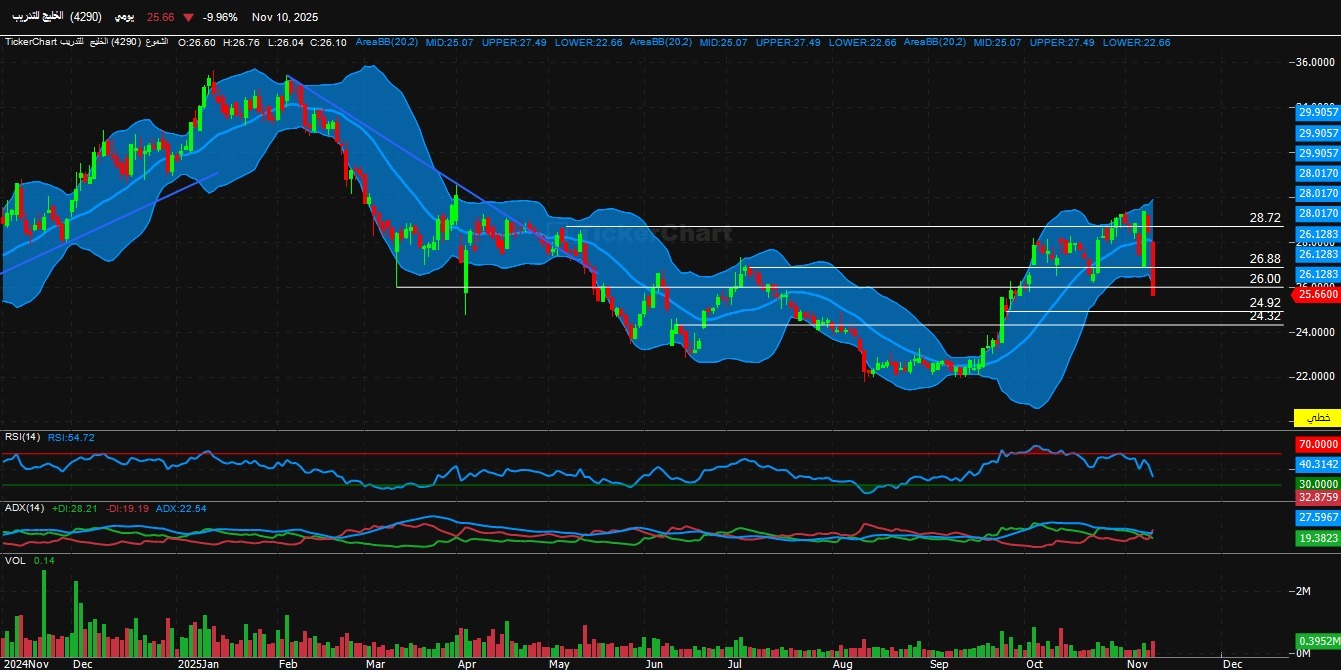 يتداول السهم في اتجاه هابط علي المدي القصير ، أعلي مستوي 24.92 يستهدف مستوي 26 ريال ثم 26.88 ريال مع تفعيل الوقف عند مستوي 24.32 ريال