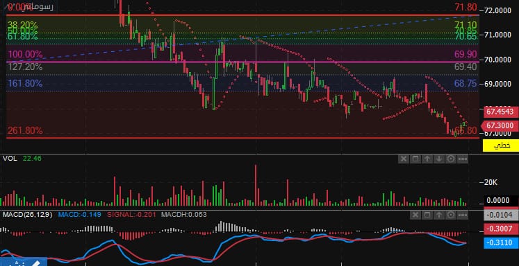 يتداول السهم بين مناطق 66.50 و 69.50 حيث يستهدف السهم 69.50 وفي حاله اختراقها يستهدف 71.80 بشرط ثباته اعلي الدعم 66.50