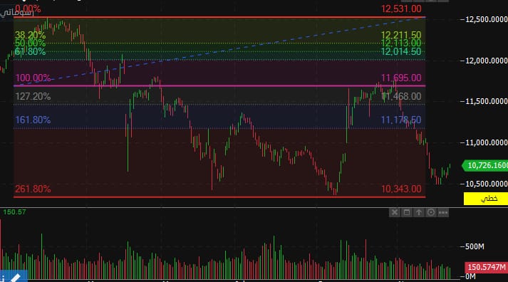 اغلق مؤشر السوق السعودي (تاسي) عند منطقه ال نقطه 10726 مرتفعا 26 نقطه تقريبا بنسبه 0.25% مرتفعا مع ملاحظه عدد الشركات الصاعده 177 شركه و 72 شركه هابطه بقيمه تداول 3.4 مليار ريال تقريبا ولاحظ ان المؤشر في اتجاه هابط وتكون منطقه المقاومه للمؤشر عند ال 11000 ثم نستهدف منطقه المقاومه التاليه عند ال 11550 نستهدف منطقه المقاومه عند ال 11800 يعتبر منطقه الدعم الحاليه للمؤشر عند ال 10340 و في حال كسرها نستهدف منطقه ال 10000
