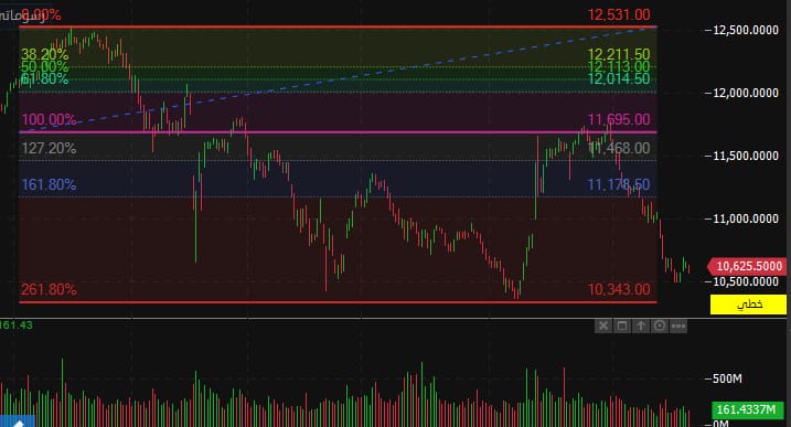 اغلق مؤشر السوق السعودي (تاسي) عند منطقه ال نقطه 10625 منخفضا 5 نقطه تقريبا بنسبه -0.05% منخفضا مع ملاحظه عدد الشركات الصاعده 84 شركه و 167 شركه هابطه بقيمه تداول 3.4 مليار ريال تقريبا ولاحظ ان المؤشر في اتجاه هابط وتكون منطقه المقاومه للمؤشر عند ال 11000 ثم نستهدف منطقه المقاومه التاليه عند ال 11550 نستهدف منطقه المقاومه عند ال 11800 يعتبر منطقه الدعم الحاليه للمؤشر عند ال 10340 و في حال كسرها نستهدف منطقه ال 10000