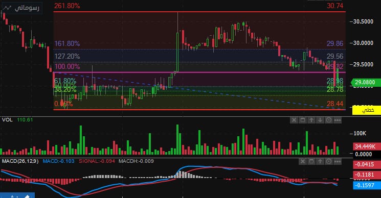 يتداول السهم بين مناطق 28.40و 29.60حيث يستهدف السهم 29.60 وفي حاله اختراقها يستهدف 30.70بشرط ثباته اعلي الدعم 28.40
