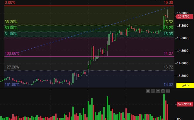 يشير التحليل الفني إلى أن المقاومة عند 16.30 ريال تشكل حاجزًا أوليًا أمام صعود السهم، وكسرها قد يفتح الطريق لتحقيق الهدف الأعلى عند 16.86 ريال.
