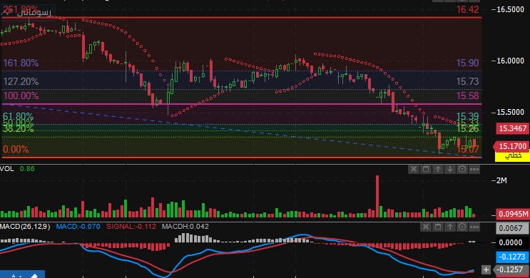 يتداول السهم بين مناطق 15 و 15.40 حيث يستهدف السهم 15.40 وفي حاله اختراقها يستهدف 15.90 بشرط ثباته اعلي الدعم 15