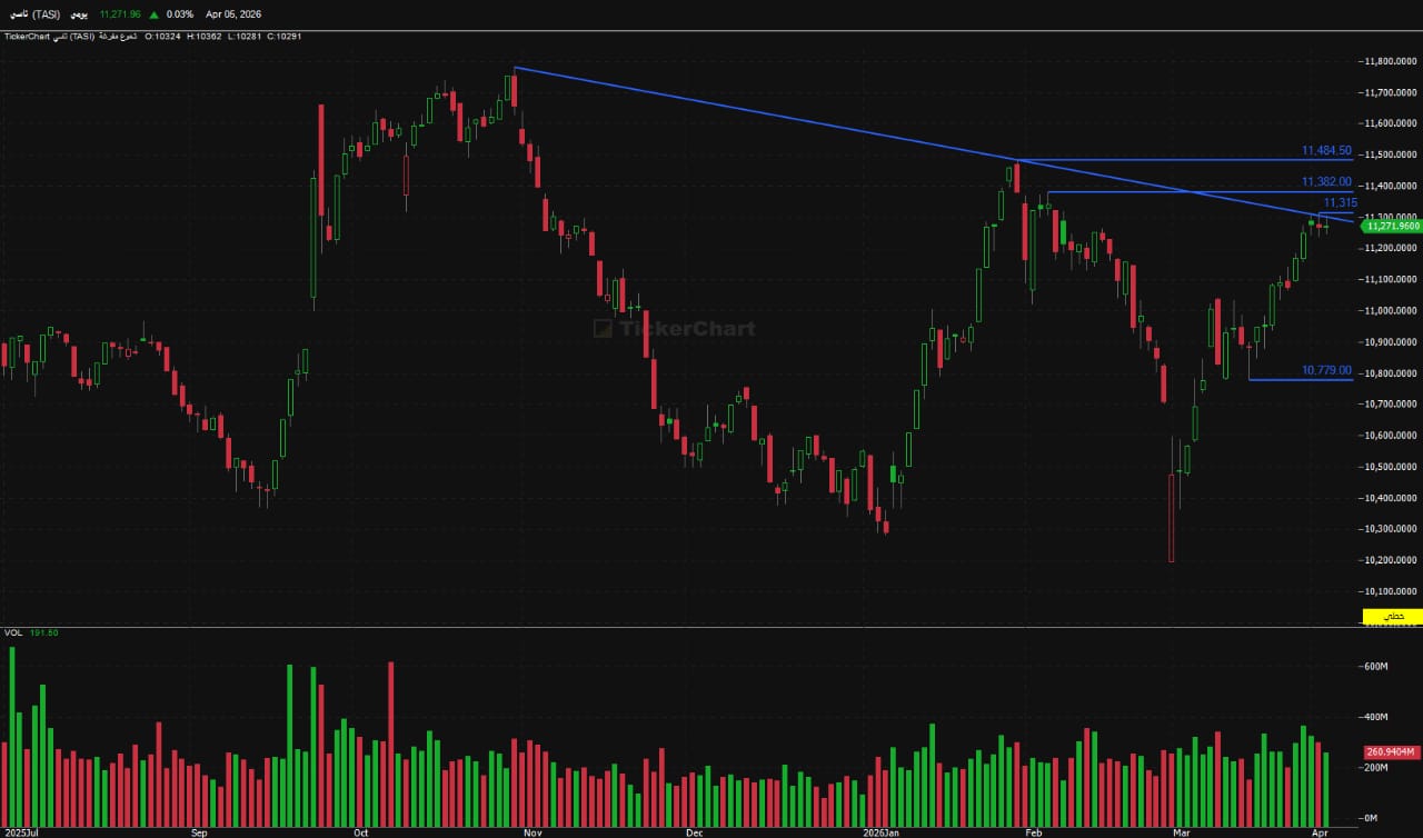 أغلق مؤشر تاسي عند مستوى 11,271 نقطة، مسجلًا ارتفاعًا طفيفًا بنسبة 0.03%، وسط تداولات بلغت قيمتها نحو 4.27 مليار ريال.
